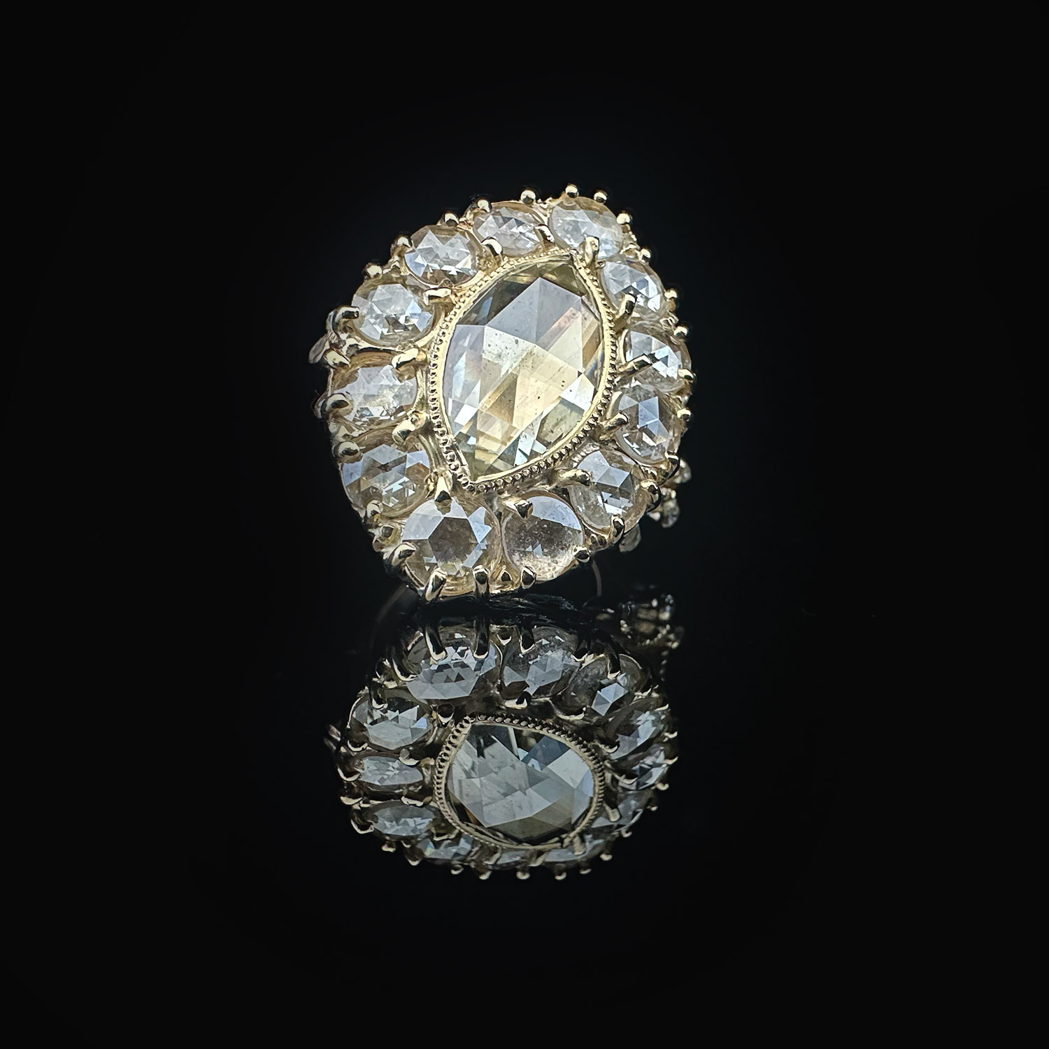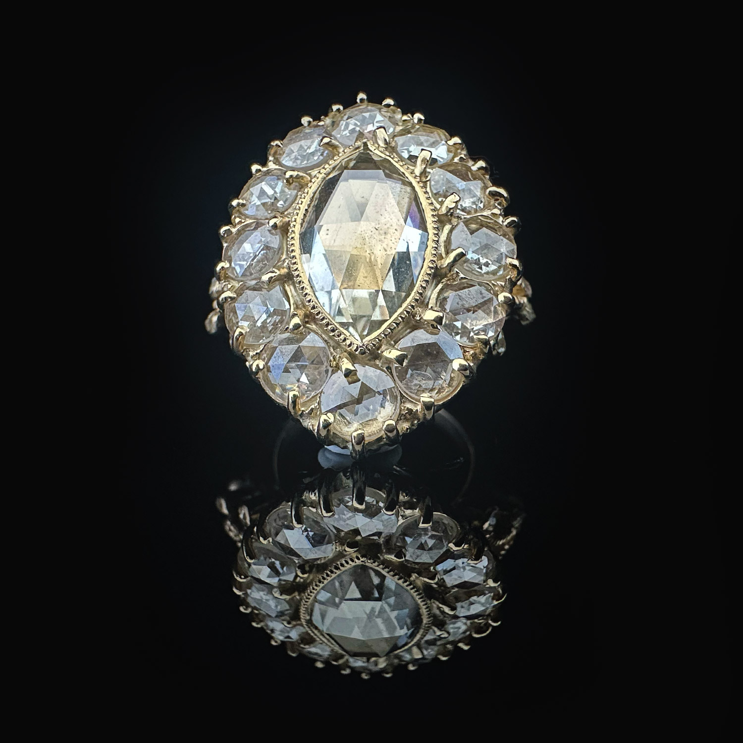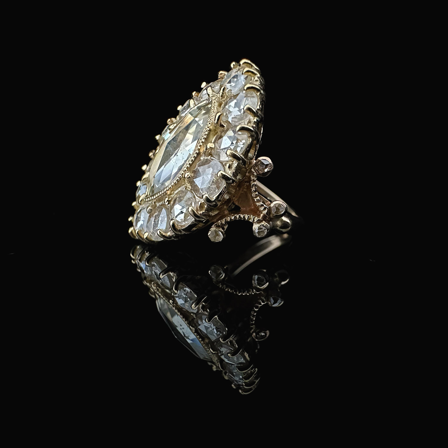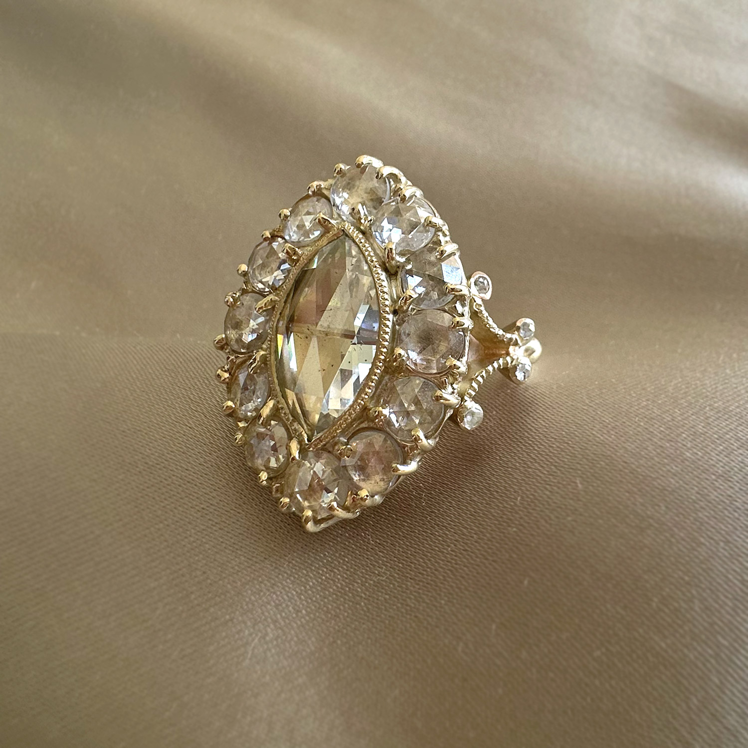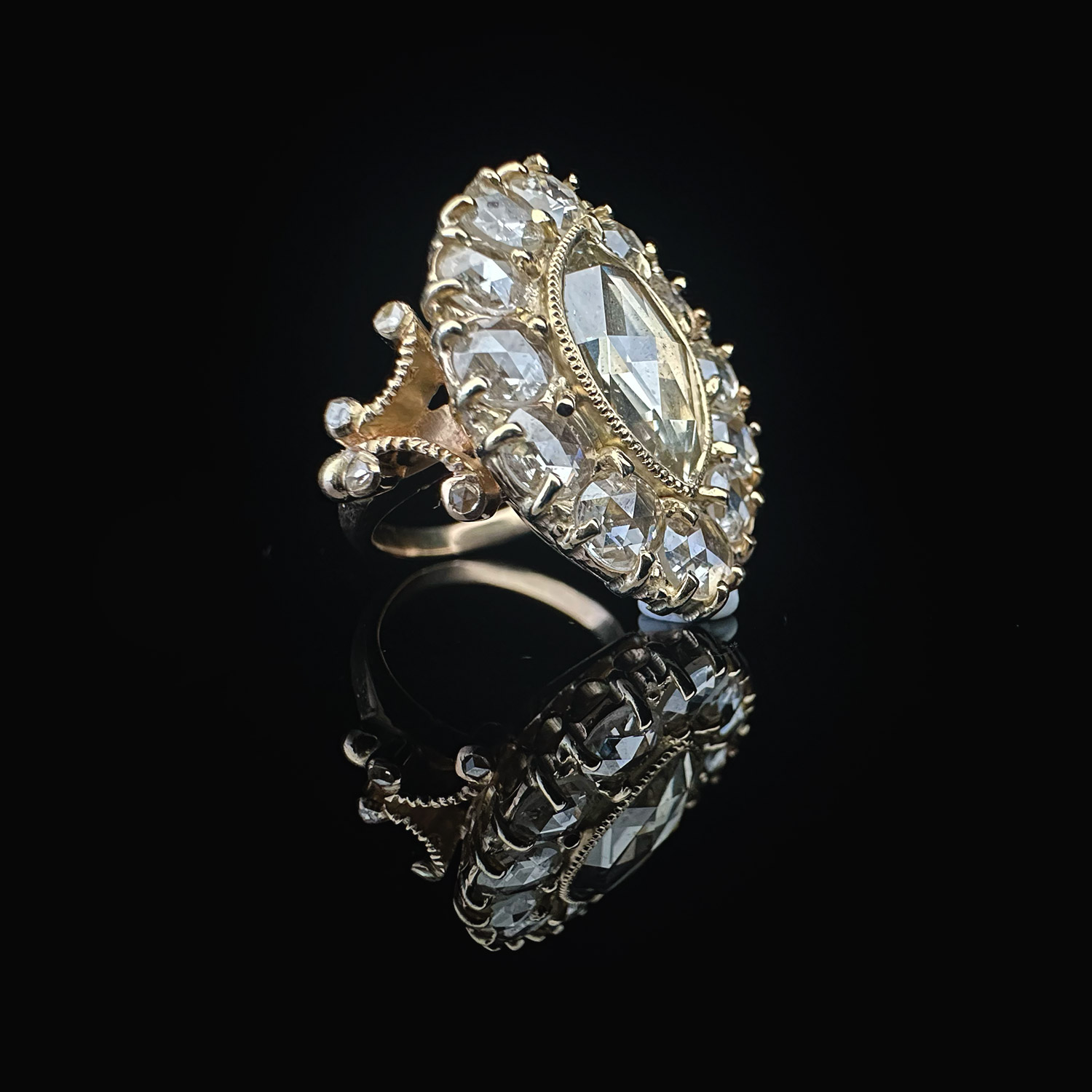 ‘Krasavitsa’-Antique rose cut marquise diamond cluster gold ring