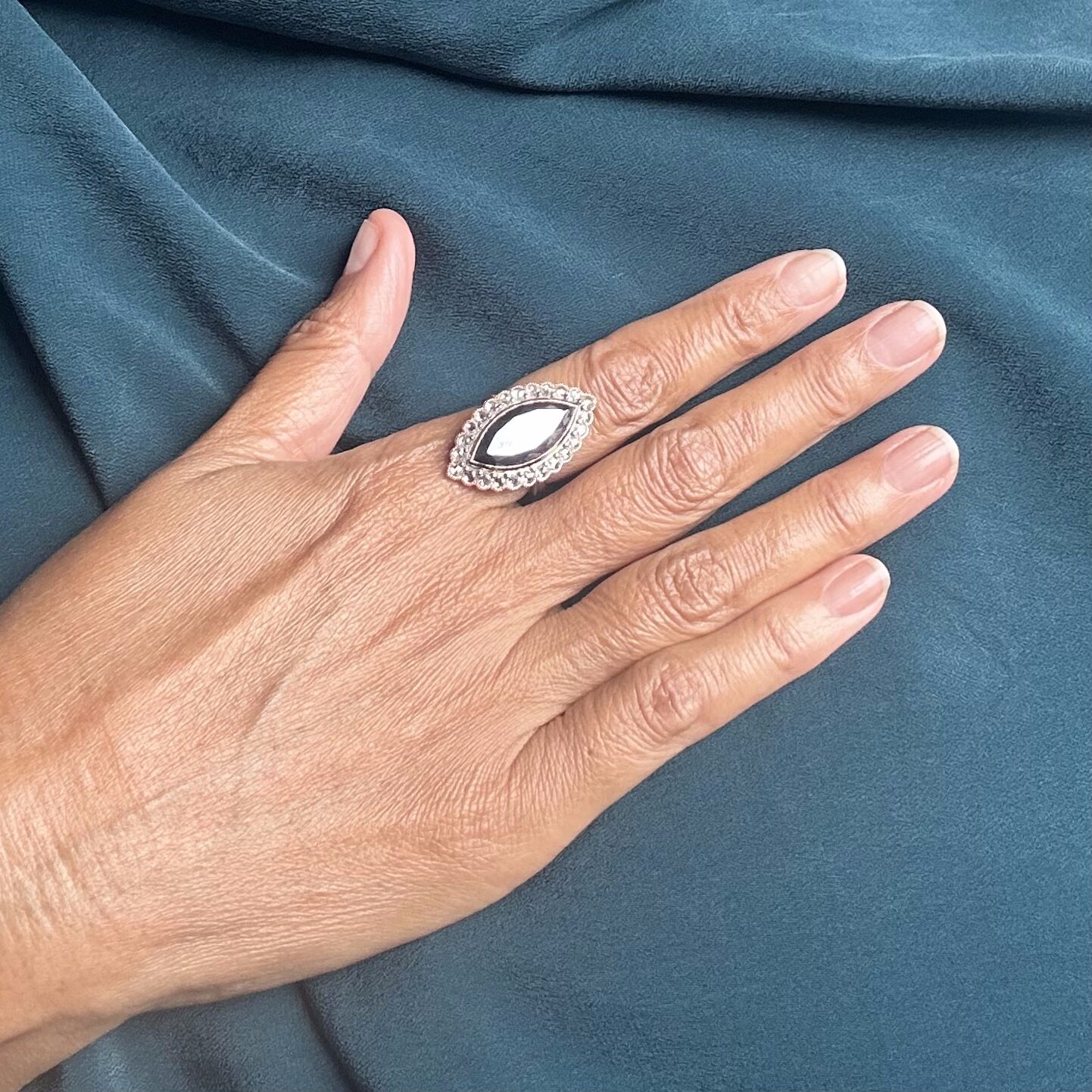 - Featuring a marquise black diamond, bezel set