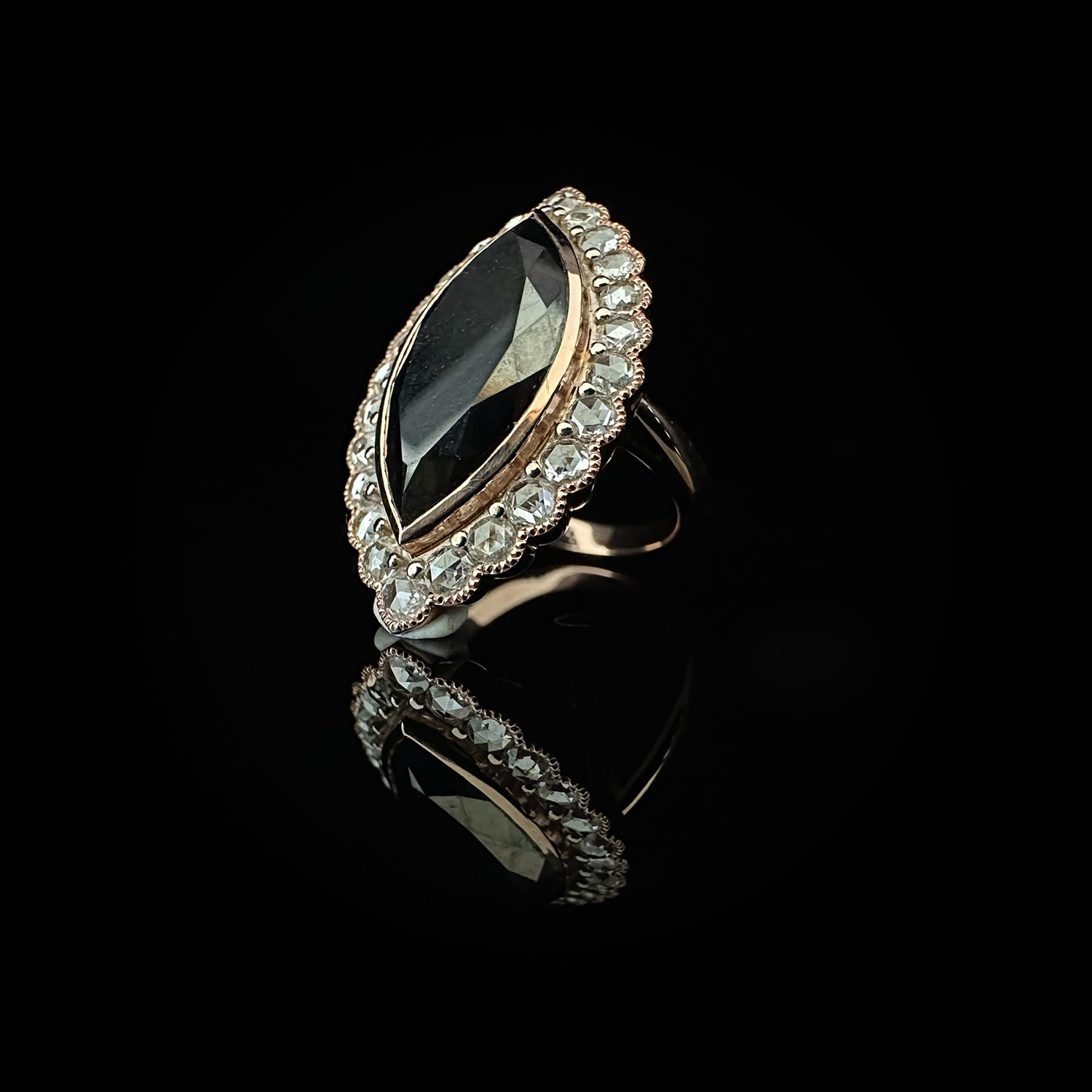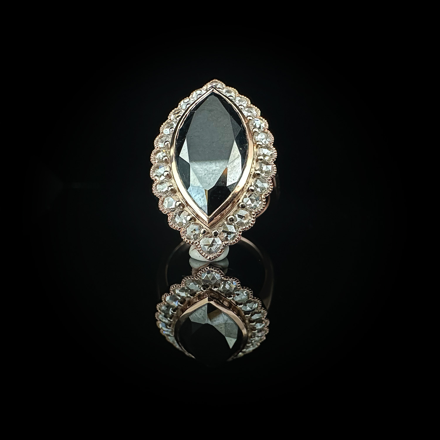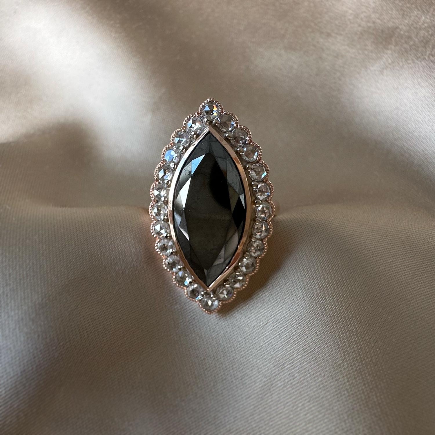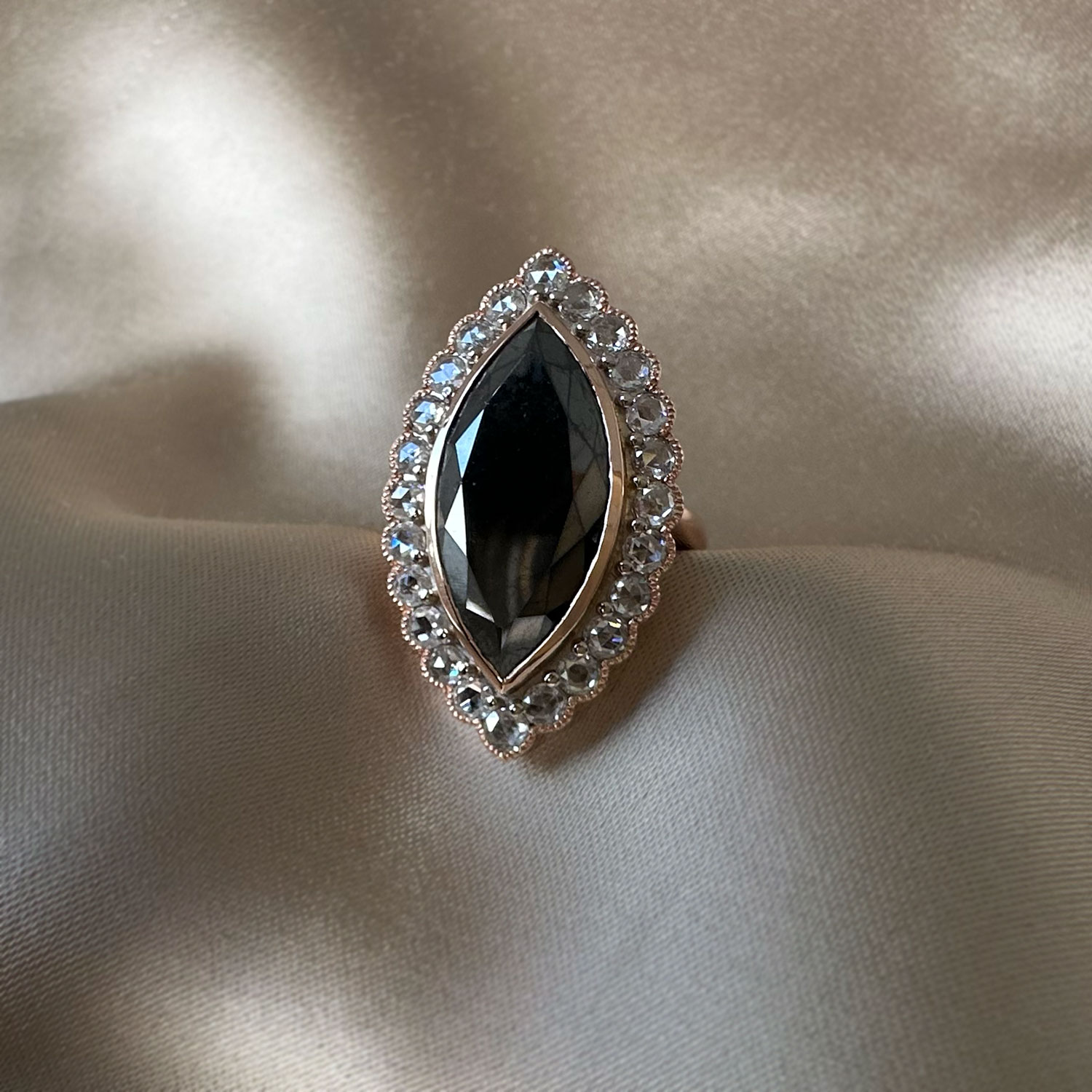 ‘Marchesa’-Black marquise diamond, white diamond and rose gold ring