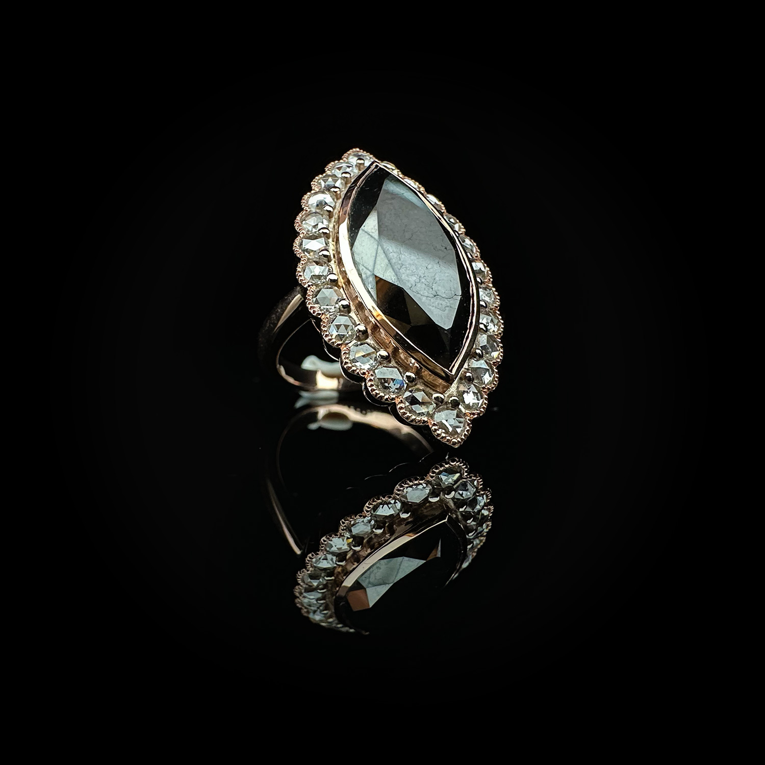 ‘Marchesa’-Black marquise diamond white diamond and rose gold ring